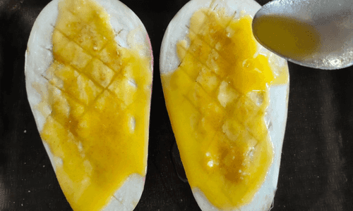 Slightly heat the melted butter in the microwave until it becomes liquid, and pour it over the eggplants so that it seeps inside through the cuts and leaves a little on top (i.e., to soak the flesh).
