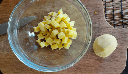 Then dice the potatoes into small cubes and place them in a bowl.