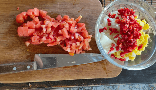 Put all the vegetables in a bowl and chop the tomato finely.