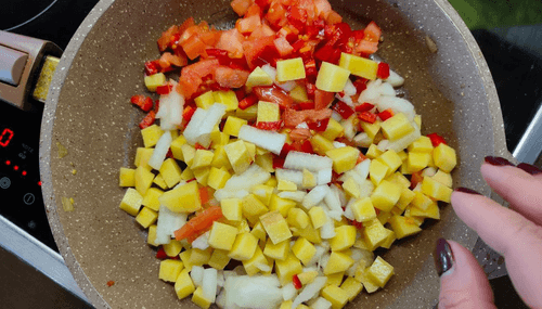 Pour the vegetables into the pan and fry until cooked in melted butter (about 15 minutes).