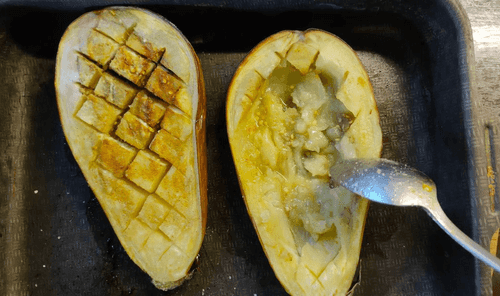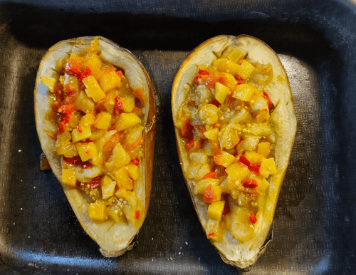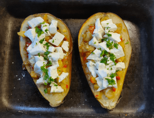 When the eggplants are ready, scoop out the flesh with a spoon, but not completely — leave a boat shape with edges for the filling.