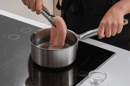 Submerge the chicken in cold salted water, bring to a boil, turn off the heat and let it sit covered for 20 minutes.