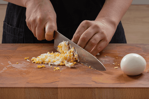 Boil the eggs hard and cut them into cubes of 5-7 mm sides.