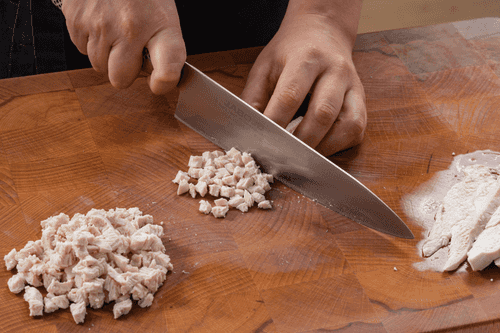 Remove the chicken from the water, let it cool slightly, and cut it just like the eggs.