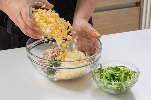 Mix chicken, cheese, eggs, green onions, and cucumbers in a bowl.