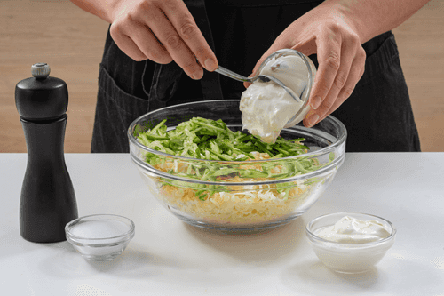 Dress with sour cream mixed with mayonnaise. Taste and add pepper and salt to your liking.