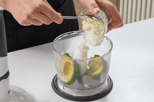 Blend the avocado flesh with cream cheese in a blender.