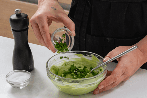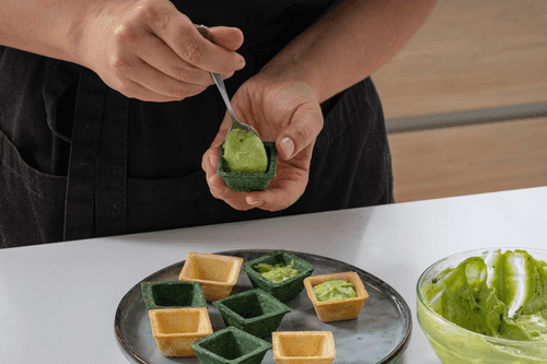 Place a mixture of cheese and avocado at the bottom of the tartlets.