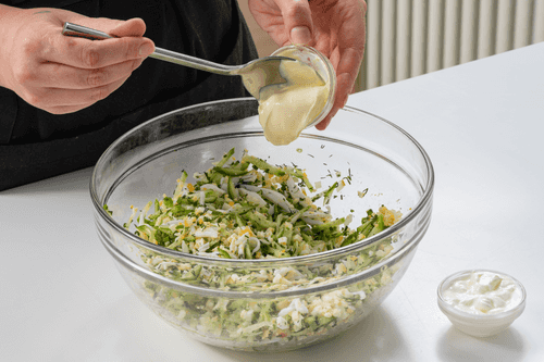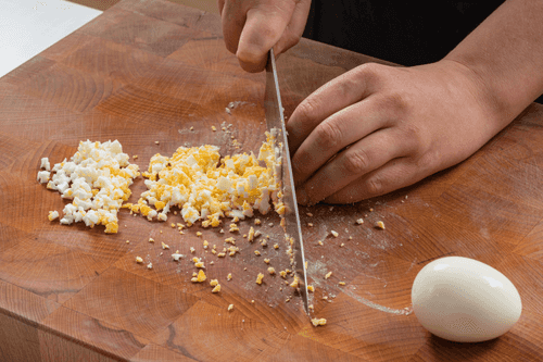 Boil the eggs hard, cool them in cold water, peel and cut into 5 mm cubes.
