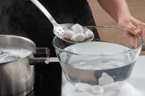 Put the cleaned squid in boiling water, let the water come to a boil again, remove the squid and transfer them to ice water.