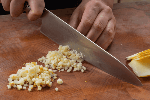Cut the smoked cheese into 5 mm cubes.