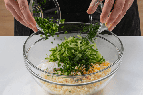 Mix squid, cheese, eggs, cucumbers, dill, and green onions in a bowl.