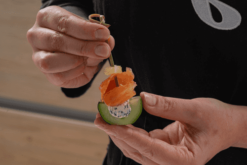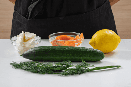 Canapes with a classic combination of ingredients. Fresh cucumber, salted fish, a slice of lemon and curd cheese to hold it all together. Assemble these canapes just before serving so that the fish doesn't have time to go stale.
