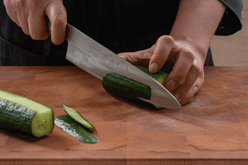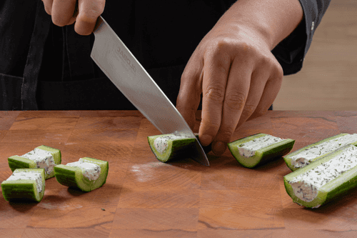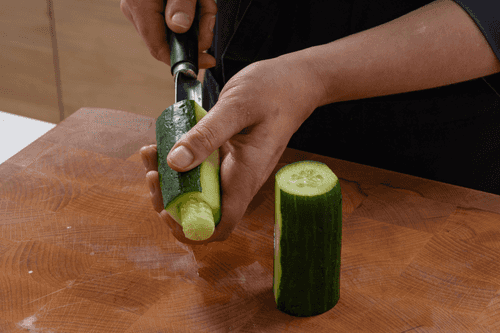 Cut the cucumber in half crosswise, then place one half on the cut side and slice off a bit of skin from two opposite sides. This is needed for the canapés to be stable.