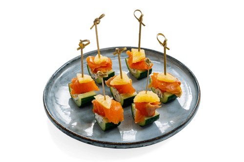 Serve canapés with cucumber and red fish at the festive table.