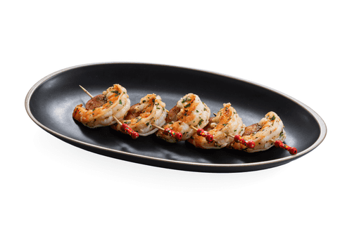 Skewer shrimp and pieces of sausage so that the shrimp seems to hug the round piece of sausage.