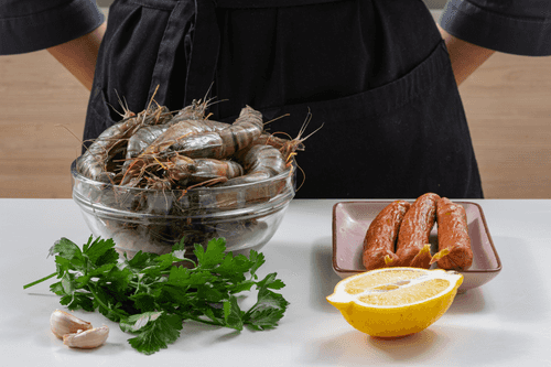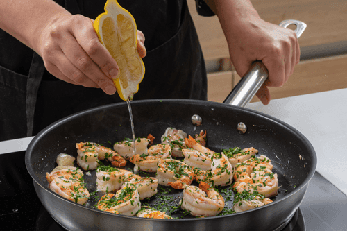 At the end, add chopped parsley to the shrimp, season with salt and pepper, and drizzle with lemon juice.