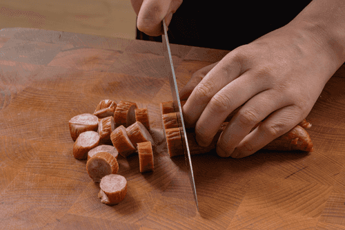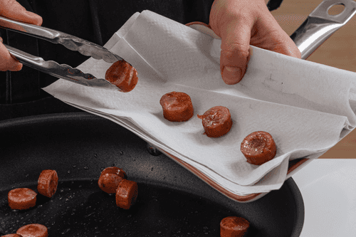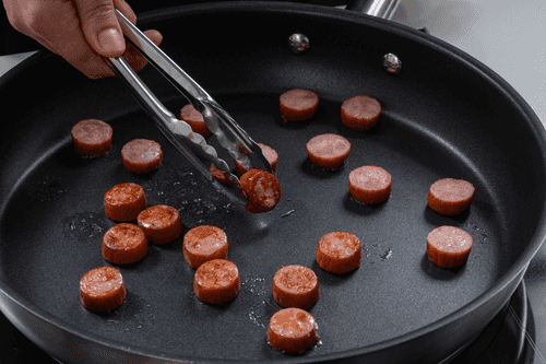 Heat vegetable oil in a pan and fry the sausages until golden brown.