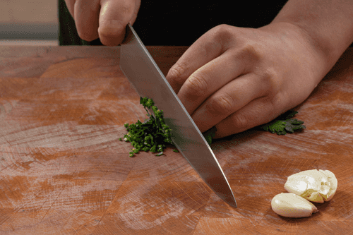 Chop the parsley and crush the garlic clove with the flat side of a knife.