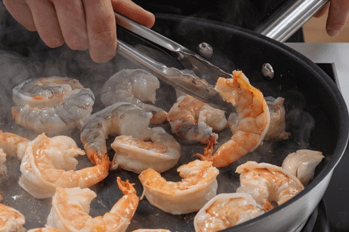 In the same pan, sauté the shrimp with garlic for 3 minutes.