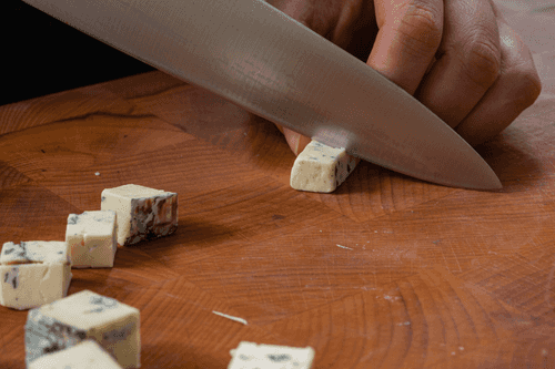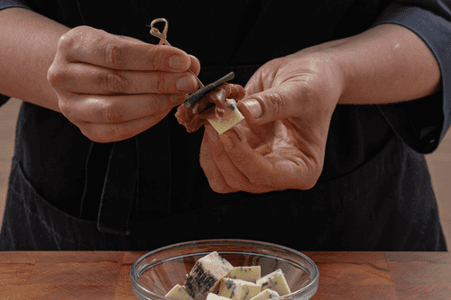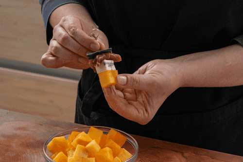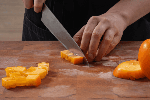 Cut the dates into 2 cm cubes; for beauty, it's better to trim all the round edges.