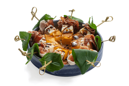 A seasonal winter appetizer for a buffet. Firstly, this canape looks very festive (due to the orange color, for which persimmon is responsible). Secondly, the rich taste of blue cheese is set off by the sweetness and softness of persimmon, and the brightest note, both in texture and color, is added by prosciutto. Thirdly, it is very satisfying: a couple of such canapes, and you can safely wait for the banquet to begin, without fear of getting hungry.