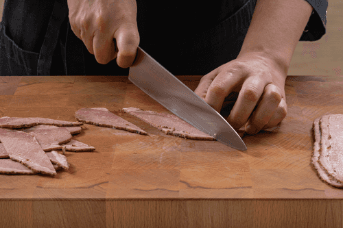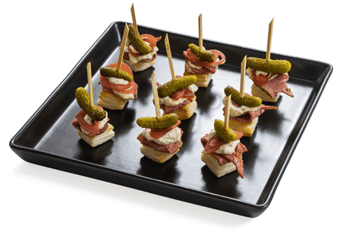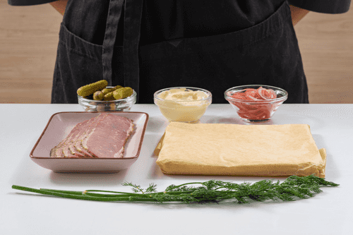 Everything is classic: pastrami (roast beef or any other type of cold cuts can be used instead), mayonnaise, pickled onions and gherkin. We recommend serving with red wine.