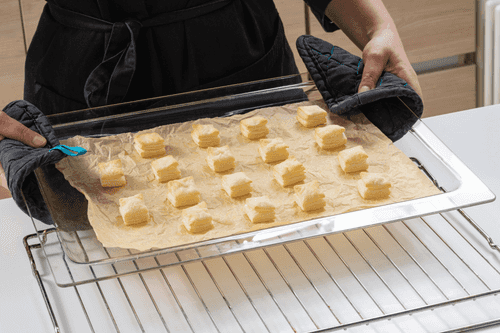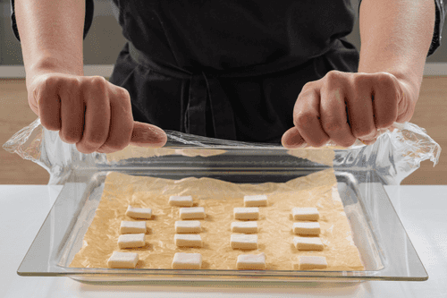 Transfer the dough to a baking sheet lined with parchment paper. Leave a small space between the squares. Cover with plastic wrap for 15 minutes.
