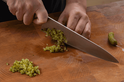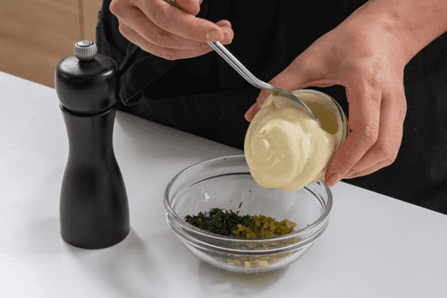 Mix chopped dill and gherkins with mayonnaise. Add pepper.