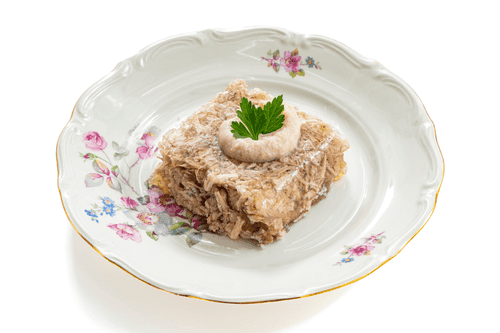 Холодец из рульки — традиционное блюдо русской кухни, которое уходит корнями в древние времена, когда хозяйки стремились использовать все части мяса. Ароматный, насыщенный, с мягким и нежным мясом, он буквально тает во рту, раскрывая богатый вкус пряностей и чеснока. Густой бульон, естественно застывающий благодаря желатину, придает холодцу плотную текстуру. Это не просто закуска, а целый ритуал: его принято подавать охлажденным с острыми дополнениями — хреном или горчицей, которые подчеркивают его насыщенный мясной вкус. Холодец идеален для праздничного застолья или уютного семейного ужина, символизируя достаток и домашний уют.