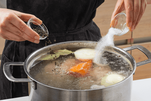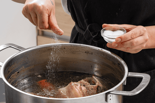 At the end of cooking, taste the broth; it should seem slightly salty. If needed, add more salt. To ensure the jelly will set, take a spoonful of broth and moisten your fingers in it, then let them dry. If your fingers are sticky, it will turn out well.
