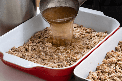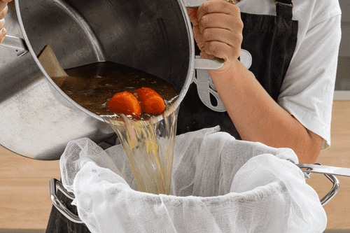 Remove the meat from the broth and let it cool slightly, then strain the broth through a fine sieve and several layers of cheesecloth.