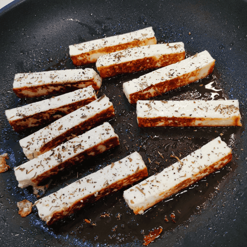 Once the bottom side is browned, flip it and season with dry herbs.