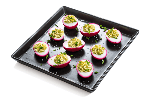 Stuffed eggs in beet marinade are an elegant and sophisticated dish of European cuisine that impresses not only with its bright appearance but also with its refined taste. The deep purple hue acquired from marinating in beet brine makes the eggs a true decoration for the festive table. The delicate filling of creamy avocado, tangy mayonnaise, and fresh aromatic herbs adds lightness and richness to the flavor. This dish not only pleases the eye but also delights with its texture – the combination of the softness of the yolk mass and the firm structure of the white creates a perfect balance. Stuffed eggs are ideal for formal events, light snacks, or culinary experiments, and their unusual color is sure to amaze guests.