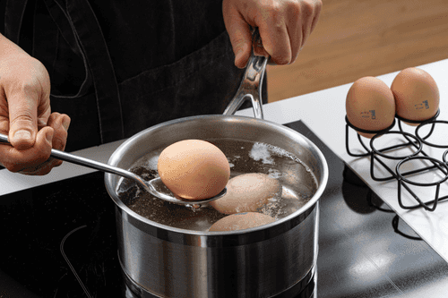 Boil the eggs hard, cool them down, and peel.