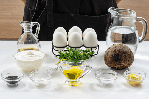 Mix the yolks with sour cream, mayonnaise, mustard, and truffle oil. Taste and add salt and pepper if necessary. Transfer the mixture to a pastry bag.