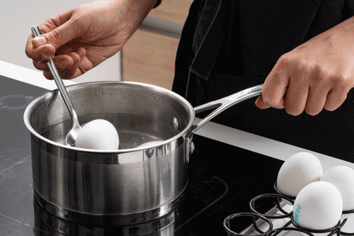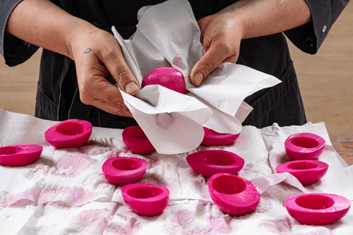 Boil the eggs hard, cool them down, and peel. Cut the eggs in half and remove the yolks.