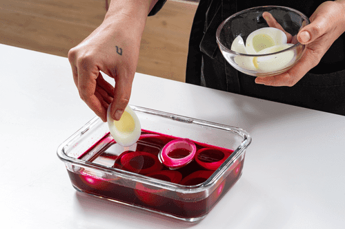 In a small saucepan, mix vinegar, water, sugar, salt, and beetroot. Bring to a boil, remove from heat, and let it cool completely.