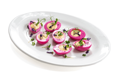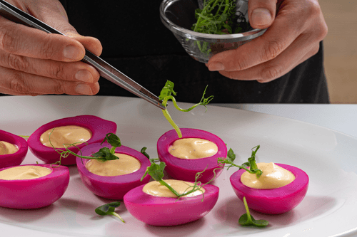 Place the yolk mixture in the halves of the egg whites. Decorate with edible flowers, microgreens, and coarse salt.