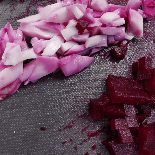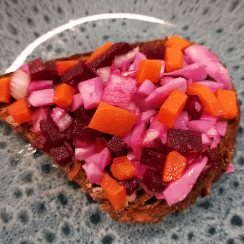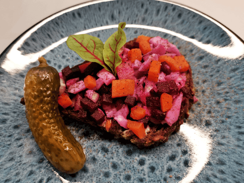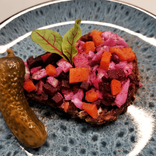 New Year's sandwich is a simple yet exquisite dish of Russian cuisine that brings festive cheer to any table. Its roots trace back to the traditions of preparing hearty and healthy snacks that combine the rich flavors of winter vegetables and rye bread. A toasted slice of black bread soaked in aromatic olive oil serves as the perfect base for a delicate combination of boiled egg, sweet beetroot, and vibrant carrot. The light spiciness of onion and a pinch of sea salt enhance the natural flavor tones, while mayonnaise adds creamy smoothness. A pickled cucumber as a garnish completes the composition with a refreshing tang. This dish is ideal for a cozy family dinner or New Year's feast when you want to enjoy the harmony of flavors and festive atmosphere.