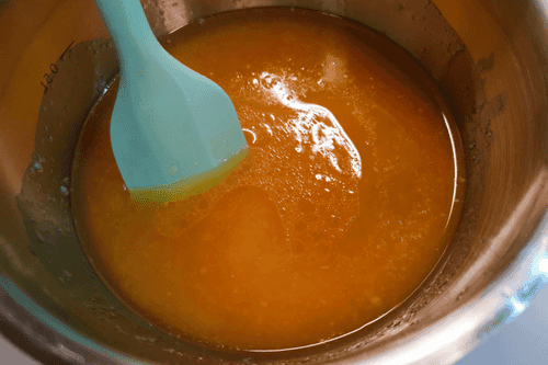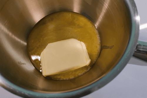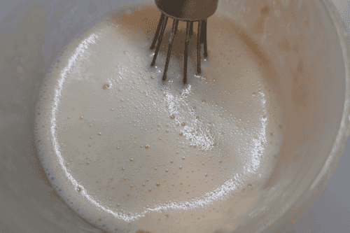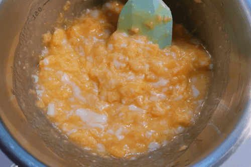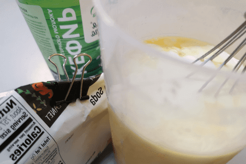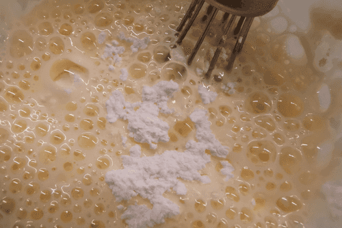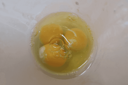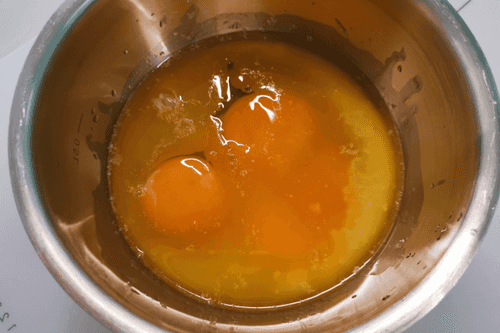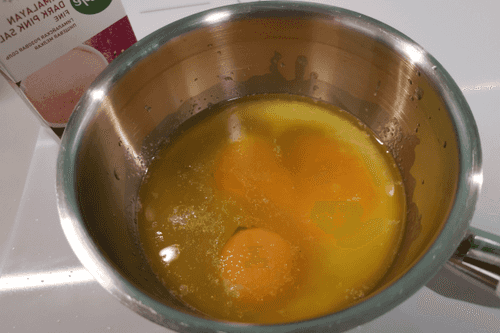 Pour the prepared mixture into the heated olive oil in the frying pan.