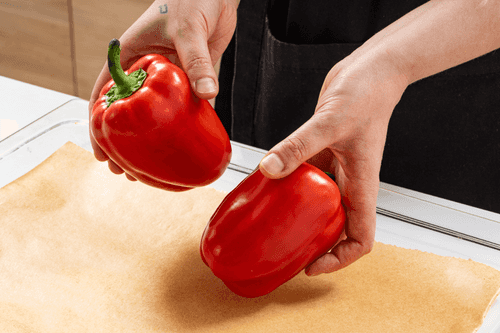Wash the peppers, place them on a baking sheet, and roast in the oven for about 30 minutes until blackened.