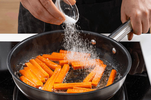 Melt butter in a pan. Fry carrot sticks until golden, sprinkling with sugar. The carrots should remain crunchy inside for easier dipping in hummus.