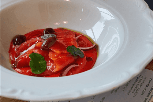 Mix pieces of trout with chopped onion, Kalamata olives, and diced tomato.