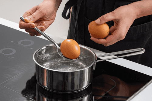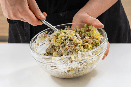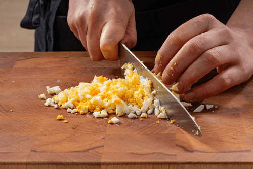 Peel the red onion, chop it into small cubes, and place it in a bowl with the eggs.