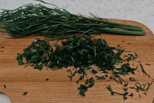 Wash the dill under running water, dry it, and chop it. Add to the garlic mixture and mix until smooth.