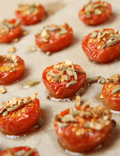 Transfer to a small baking tray. Bake for 10 minutes, until the tomato slices just start to lose their shape.