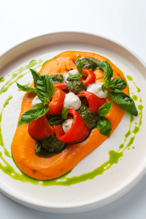 Place rolled pieces of roasted ramiro peppers on top.
