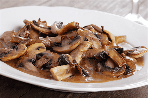 Chop the white mushrooms and place them in a pan with wine, add salt and pepper. Bring to a boil and immediately reduce the heat. Simmer covered for 30 minutes. Remove from heat, add sour cream and a portion of grated nutmeg. Heat without boiling.