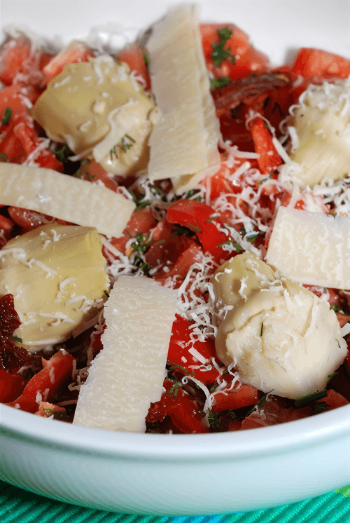 Arrange the roasted tomatoes on serving plates with artichokes and add seasonings to taste. Top with freshly chopped parsley and add crispy parmesan.